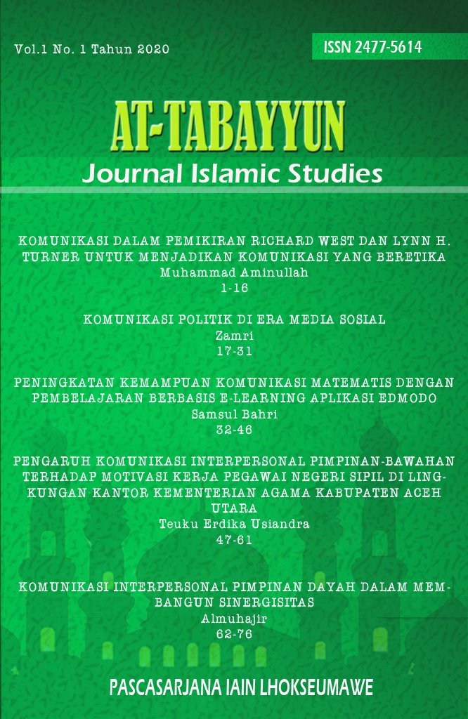 Edisi ini merupakan edisi versi cetak dan belum ber E-ISSN dan di online-kan oleh redaksi demi memperkaya literatur keilmuan. Pada Volume 2 nomor 1 Jurnal AT-TABAYYUN - JOURNAL ISLAMIC STUDIES menerbitkan 5 (Lima) artikel, yaitu: Komunikasi dalam Pemikiran Richard West dan Lynn H. Turner untuk Menjadikan Komunikasi yang Beretika Komunikasi dalam Pemikiran Richard West dan Lynn H. Turner untuk Menjadikan Komunikasi yang Beretika, Komunikasi Politik di Era Media Sosial, Peningkatan Kemampuan Komunikasi Matematis Dengan Pembelajaran Berbasis E-Learning Aplikasi Edmodo, Pengaruh Komunikasi Interpersonal Pimpinan-Bawahan Terhadap Motivasi Kerja Pegawai Negeri Sipil di Lingkungan Kantor Kementerian Agama Kabupaten Aceh Utara, Komunikasi Interpersonal Pimpinan Dayah dalam Membangun Sinergisitas.