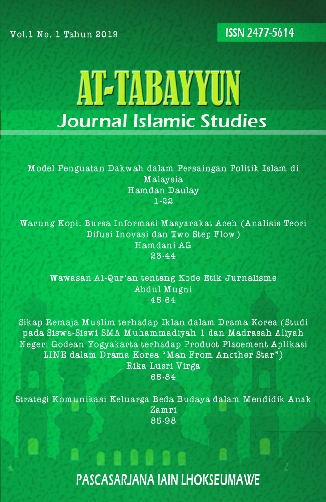 Edisi ini merupakan edisi pertama versi cetak dan belum ber E-ISSN dan di online-kan oleh redaksi demi memperkaya literatur keilmuan. Pada Volume 1 nomor 1 Jurnal AT-TABAYYUN - JOURNAL ISLAMIC STUDIES menerbitkan 5 (Lima) artikel, yaitu: Model Penguatan Dakwah dalam Persaingan Politik Islam di Malaysia, Warung Kopi: Bursa Informasi Masyarakat Aceh (Analisis Teori Difusi Inovasi dan Two Step Flow), Wawasan Al-Qur’an tentang Kode Etik Jurnalisme, Sikap Remaja Muslim terhadap Iklan dalam Drama Korea (Studi pada Siswa-Siswi SMA Muhammadiyah 1 dan Madrasah Aliyah Negeri Godean Yogyakarta terhadap Product Placement Aplikasi LINE dalam Drama Korea “Man From Another Star”), Strategi Komunikasi Keluarga Beda Budaya dalam Mendidik Anak.